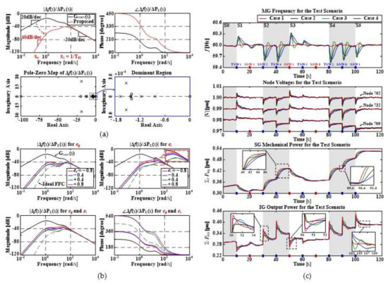 (a) Bode plots of the Δf(s)/ΔPL(s) values for the new FR strategy (Case 1) and conventional FR strategies (Cases 2–4); (b) Bode plots of Δf(s)/ΔPL(s) values with the errors in DG parameter estimates; and (c) comparisons of f, |V|, Σg PMg, and Σi PIGi (from top to bottom) during NR-aided load restoration.