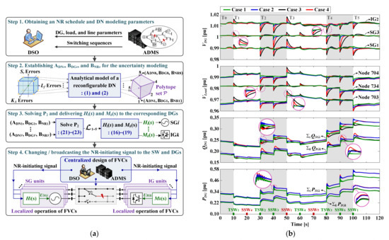 (a) A flowchart for implementation of the proposed FVCs and (b) comparisons of VDG, VLoad, QDG, and PDG (from top to bottom) between the new proposed VR strategy (Cases 1 and 2) and conventional VR strategies (Cases 3 and 4) for NR-aided load restoration.