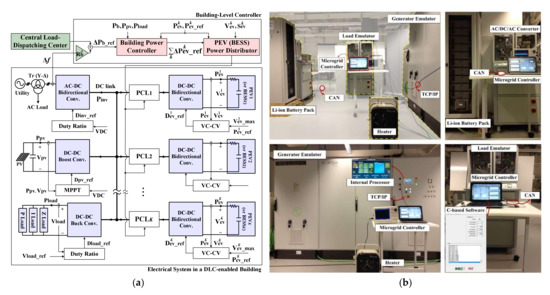 (a) A schematic of a new electrical system inside a commercial building and (b) the experimental setup of an MG including a generator emulator, a battery pack, and a load emulator.