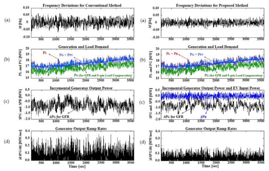 Experimental case study results for the (left) conventional and (right) proposed FR strategies: (a) frequency deviations Δf, (b) load demands PL, dispatchable generation PG, and total generation PG + PPV, (c) variations in generator output power ΔPG and in battery input power ΔPB, and (d) dynamic ramping rate of generation |dΔPG/dt|.