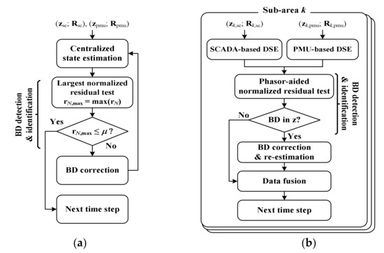 Flowcharts of (a) a conventional, centralized hybrid SE strategy and (b) a proposed, decentralized PHASE strategy, both of which include BD detection, identification, and correction steps.