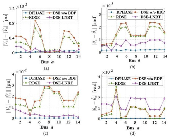 Comparison of absolute SE errors: (a,b) voltage magnitudes and phase angles for the BD in the SCADA measurements and (c,d) voltage magnitudes and phase angles for the BD in the PMU measurements.