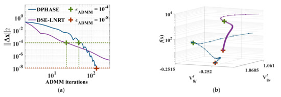 Variations (a) in the errors of the estimated states and (b) in the objective values, by the number of ADMM iterations for different convergence thresholds εADMM.