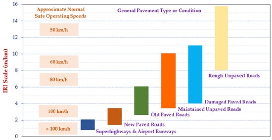 In addition to the control of depressions and changes in the grade line gradient, the parameters of the pavement surface sensitive to subsoil deformations should also be assessed. The most important parameter is the longitudinal evenness of the pavement, which is assessed using the IRI (International Roughness Index). Determining the IRI enables measurement with a laser profilograph. This index was developed by the World Bank in the 1980s [] and should be equated to the description of the change in the shape of the pavement surface. It is defined as “the accumulated suspension vertical motion divided by the distance traveled as obtained from a mathematical model of a simulated quarter-car traversing a measured profile at 80 km/h” []. This index is the basic tool for assessing the quality of the pavement after construction, during use and after modernization [,,,,]. The guidelines for calculating the IRI are described in the documents [,]. The characteristics between the IRI and driving comfort were presented by Sayers [] (Figure 1) and Bridgelall et al. [] (Table 1).
