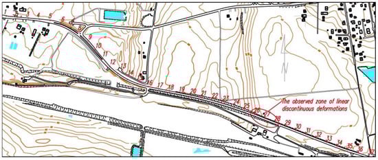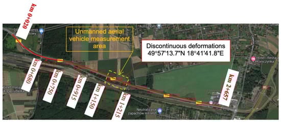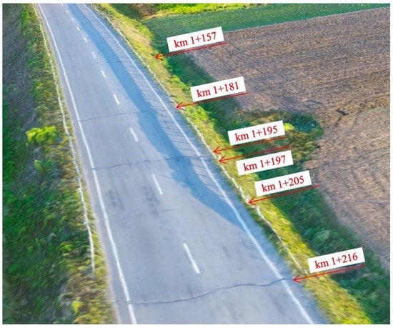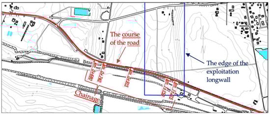 Communication routes, such as roads and rail roads, are of key importance for the functioning of society and the economy of each country. Therefore, this type of linear object is classified as so-called critical infrastructure [,]. A special case of the operation of this type of facility is areas of mining activity. Unfortunately, the functioning of roads in mining areas is associated with the occurrence of additional threats resulting from the inevitable deformation of the subsoil. Mining impacts on the ground surface can manifest themselves in the form of continuous and discontinuous deformations, among others. A consequence of mining impacts on building structures, including roads, is additional impacts in the form of displacements and deformations, leading to deterioration of functional features, or even damage to the objects [,,,,]. Due to the deterioration or even damage to them, the key issue is the possibility of monitoring the impact of mining operations on their technical condition, as well as obtaining data enabling forecasting of the scope of the technical condition change, in terms of predicting the consequences of the planned mining operation in the line of the linear object.