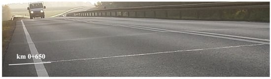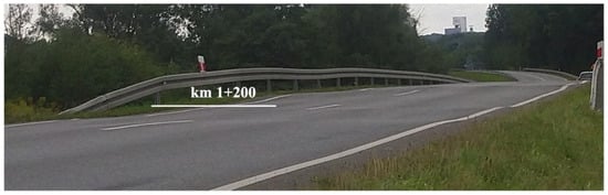 The research area is located in the southern part of Silesia Province. The subject of the observation is a road of regional importance (Figure 3). This section is under the influence of deep mining exploitation, conducted for many years, and the road was built and commissioned in 2017. The road has a cross-section with one road and two traffic rights-of-way. The right-of-way width is 3.50 m, and the shoulder is 2.50 m. The road has KR6 [] traffic, which corresponds to the penultimate highest traffic load category. The road has a flexible pavement, with a thickness of 32 cm and mineral–asphalt layers and layers of an unbound mixture on the lower ground. In addition, a 60 cm-thick geomaterial is used in the layer system, which should, to a large extent, reduce deformations on the road surface.