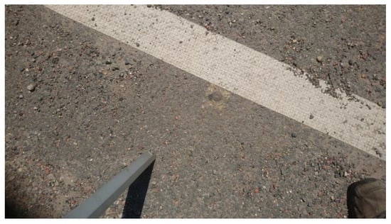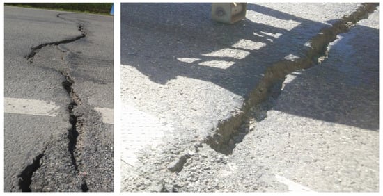 Discontinuities in road structures are a serious problem because they deteriorate the condition of the road surface and pose a threat to users’ safety (change in pavement evenness) []. The results of measuring the pavement deflection with an FWD (falling weight deflectometer) apparatus indicate that when the subsoil and pavement layers loosen, a reduction in the stiffness of the subsoil and pavement layers is observed. Discontinuous deformations appearing on the road surface require repair works at least restoring the evenness of the surface and the required load-bearing capacity [].