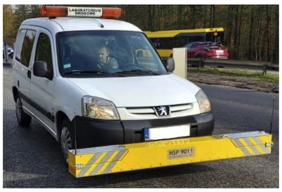 The longitudinal evenness of the pavement was measured on the analyzed road section using a mobile laser profilograph. The measurement allowed determining the IRI (mm/m) in accordance with [,]. A Polish-made laser profilograph, HSP9011, was used for the research (Figure 9). The measurement accuracy of the device complies with the requirements of Polish regulations on the systemic assessment of the pavement condition [] (Table 2). The measurement was conducted in the longitudinal profile in the left right-of-way.