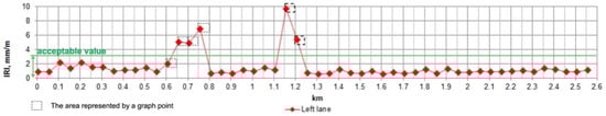 The calculated IRI (Figure 10) represents the equality of the 50 m-long measurement section []. The detailed methodology of calculating the IRI is described in [,,,]. The binding regulations require that, for this class, none of the IRI values should be higher than 3.4 mm/m [].