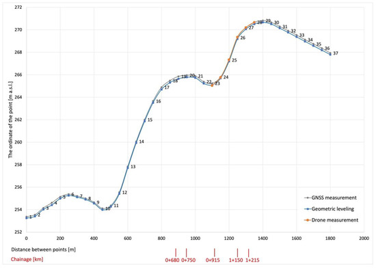 As part of the research program, the situational and height measurement of the measurement points was performed. Field measurements refer to the observation line consisting of 37 stabilized points along the right-of-way (Figure 11 and Figure 12). The distance between the points was 50 m.