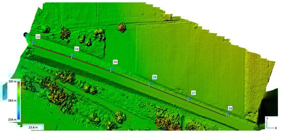 At the post-processing stage, a hypsometric map was also created (Figure 15) using the following color scale—from dark green (representing the lowest area) to orange (for the highest area). Following the location of the observation line, the course of the longitudinal profile was determined, starting from 1.1 km at point 23 to 1.35 km, represented by point 28. The elevation of the terrain with the marked area of deformation is shown in Figure 16.