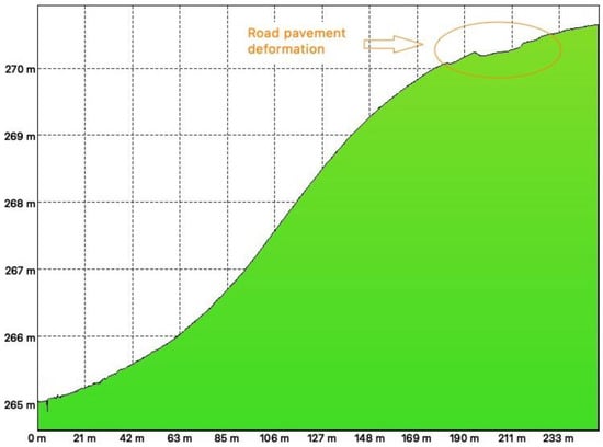 Longitudinal profile of the section shown in Figure 15 together with the marked section of the deformed road surface.