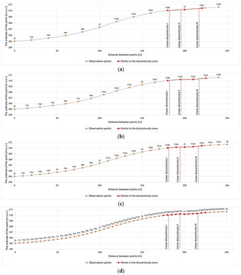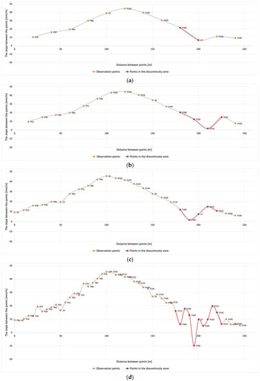 The analysis of the identification of discontinuous deformations was started with the compaction of the measurement points, for which the location was obtained as a result of processing data from the UAV (unmanned aerial vehicle) flight. In the first stage, it was necessary to determine the optimal distance between the measurement points. As the stabilized field points were located at a distance of 50 m, it was decided to compact the measurement points starting from a distance of 20 m (point group “a”) and then stepwise reduce the distance between the points—15 m (point group “b”), 10 m (point group “c”) and 5 m (point group “d”). For each group of generated measurement points, the pavement surface heights (Figure 17a–d), the slope of the pavement surface (Figure 18a–d) and the curvature of the pavement surface of the measurement sections (Figure 19a–d) were determined. The heights of the pavement surface at individual points (groups from “a” to “d”) were read from the hypsometric map (Figure 15). The next parameters describing the shape of the pavement surface were calculated on the basis of the read ordinates and the distance between the points, i.e., the slope according to Relation (1), and the curvature according to Relation (2), according to [].
