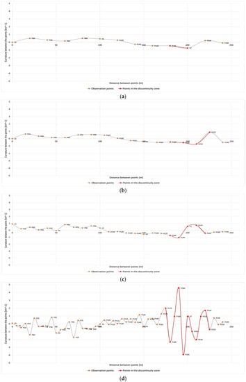 Both in the case of the slope (T) and curvature (K) of the pavement surface, a gradual identification of the discontinuous deformation zone is noticeable. Along with the densification of the measurement points, greater fluctuations for the discontinuous deformation zone are observed in relation to the other measurement points. The greatest fluctuations in the area of discontinuous deformations in relation to the remaining sections are observed in the case of curvature (K) and point density every 5 m (point group “d”) (Figure 19d).