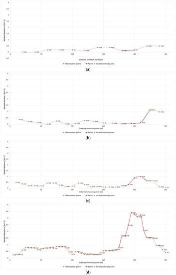 The assessment of the distribution of standard deviations shows that, along with the densification of the measurement points, a more pronounced increase in the standard deviation in the area of discontinuous deformations is observed. The distribution of values for points spaced every 20 m does not identify the area of discontinuous deformations at all. The differences between the discontinuous deformation area and the rest of the road area are visible only in the case of the points spaced every 15 m (Figure 20b). In this case, the standard deviation in the deformation area is, at maximum, σ = 1.0 km(−1), and outside the deformation area, it is less than σ < 0.5 km(−1). There is a 100% difference in the deviation value here. Unfortunately, the area of deformation in terms of length is not as clearly defined (Figure 20b) as in the case of the points spaced every 10 m (Figure 20c) or every 5 m (Figure 20d). The most precise area of discontinuous deformations is identified for points spaced every 5 m (Figure 20d). In this case, the standard deviation outside the deformation area is σ < 1.0 km(−1), and in the area of inequality, it is σ = 3.4 km(−1) at maximum, and thus there is a difference of more than 300%.