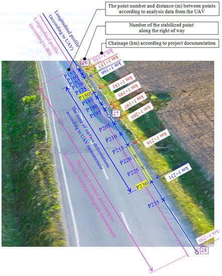 Classic geometric leveling was performed with the use of an optical leveler with an accuracy of +/− 1–2 mm. At the same time, a measurement was performed with the use of the GNSS (global navigation satellite system) technique with the use of the RTK (real-time kinematic) method. The real state of the road surface was recreated using low-ceiling photogrammetry with the use of an unmanned aerial vehicle (drone). Detailed data of the raid are presented in the next chapter of this article.