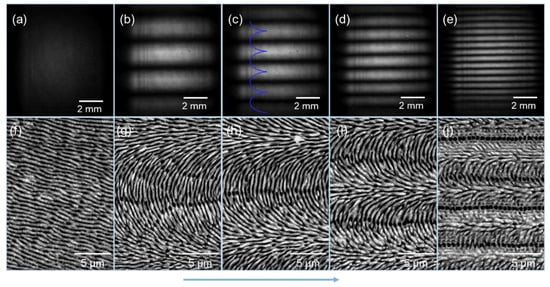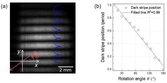 When the grating vectors of RG1 and RG2 were conjugated relative to the 4f system, we found that the combined femtosecond laser beam after RG2 was a scalar beam with horizontally linear polarization. When rotating RG2 around its normal direction, we generated a non-cylindrical vector beam with spatially changing linear polarization. The polarization distribution of the non-cylindrical vector beam was investigated by the setup shown in the dashed frame of Figure 1. When LP2 with horizontal transmission axis was employed, the beam intensity distribution recorded by the CCD camera (LU135M, Lumenera Inc., Ottawa, ON, Canada) was shown, as presented in Figure 2a. During the experiments, as the angle θ between the transmission axis of LP2 and the x-axis increased (see Figure 2a), the periodic intensity distribution in Figure 2a gradually moved towards the negative direction of the y-axis. The dependence of the dark stripe’s position in Figure 2a on θ is presented in Figure 2b, which quantitatively shows the polarization state of the femtosecond vector beam. The goodness of fit (R2) was 0.99, showing that a perfect linear relationship existed between the dark stripe position and θ. Thus, this concludes that the local polarization direction of the femtosecond vector beam can be indicated by the tangential direction of the blue solid curve shown in Figure 2a. The polarization variation speed along the vertical direction increased with the increase in the rotation angle of RG2. A further explanation of the formation of the vector beam by the setup in Figure 1 can be found in [29,30].