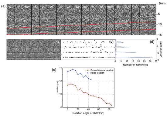 When we gradually rotated the HWP2 shown in Figure 1, the local linear polarization of the femtosecond vector beam rotated as a whole, inducing the shift of the nanostructures on the tungsten surface along the direction perpendicular to the target scanning direction, i.e., along the vertical direction shown in Figure 4a. Taking the case that the rotation angle of HWP2 was 25° as an example (see Figure 4b), using ImageJ software [31], we were able to extract the nanoholes from the SEM picture in Figure 4b. The processed picture is presented in Figure 4c. By counting the holes in Figure 4c, we were able to provide the dependence of the hole number on the location along the vertical direction, which is given in Figure 4d. It was seen that the nanoholes tended to appear at the vertexes of the curved ripples. The spatial interval between adjacent spikes shown in Figure 4d was simply the spatial period of the polarization variation of the focused femtosecond laser beam on the tungsten surface. Therefore, the location of the spike with the maximal number of holes was chosen to indicate the location of the nanoholes. The dependence of the nanoholes’ location on the angle of HWP2 is shown as the square dots in Figure 4e. The curved ripples’ location is indicated by the bordering between adjacent curved ripples, which is presented by the red solid line in Figure 4a. The dependence of the curved ripples’ location on the angle of HWP2 is presented as circular dots in Figure 4d. It can be seen that the locations of the nanoholes and the curved ripples changed synchronously with the increase in the angle of HWP2. Therefore, it was concluded that the nanoholes were generated due to the polarization distribution of the femtosecond vector beam.