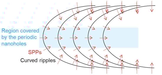 It is commonly accepted that the periodic ripples are generated due to the interference between the femtosecond laser beam and its induced SPPs [18]. Therefore, the ripples’ radius of curvature can be controlled by the polarization distribution of the incident femtosecond laser beam, as shown in Figure 3. When the orientation of the linear polarization rotated quickly at the beam cross-section, all of the nanoholes appeared at the vertexes of the curved ripples. The vertexes of the curved ripples were the converging point of SPPs, which is schematically presented in Figure 5. Therefore, on the tungsten surface, after irradiation by the femtosecond laser, the vertexes of the curved ripples had the most intensive SPPs. The nanoholes are considered to be generated due to the interference between the femtosecond laser and the focused SPPs [32].