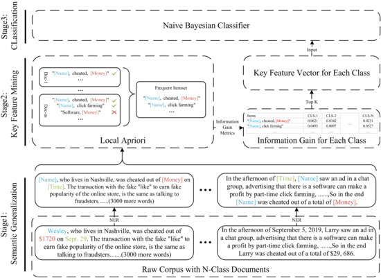 Formally, given raw data with n texts, with respect to a specific category C, where stands for the text. The task of text classification is to determine which particular category each document belongs to. In this section, we introduce the implementation details of MIPELD. The model’s architecture is shown in Figure 2. In the first stage, the selected text entities are replaced with unified entity labels using the BiLSTM-CRF model. In the second stage, an improved Apriori algorithm is utilized to obtain the frequent word sets of the text. A distance constraint function is devised to extract words that are close to each other within a certain range. Then, feature words and frequent itemsets are selected under the guidance of information gain metrics. Based on these features, each text is converted into vectors according to the word frequencies. In the third stage, we feed these vectors into the Naive Bayesian model to train a classifier.
