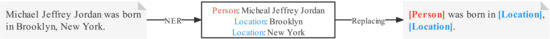 Entity information in text is important for text classification. However, the number and classes of entities in long document are so numerous that the constructed text vectors will be sparse if they are selected as features directly. Hence, we leverage named entity recognition to process the text. Specifically, to obtain the entity information in the original text, we use a model incorporating bidirectional long short term memory and a conditional random field layer (BiLSTM-CRF) [61] to obtain the representation of a word with its left and right context and produce a valid sequence of output labels. Finally, we replace the entity names with the entity labels, as shown in Figure 3.