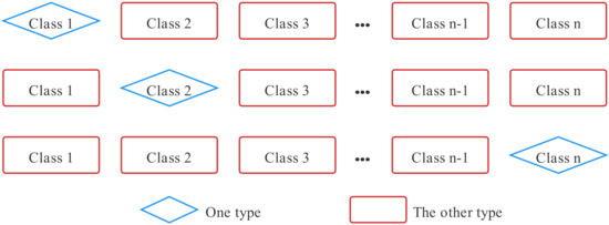 where denotes the number of texts; || denotes the amount of type of text. In particular, we adopt the “one vs. rest” method to calculate the conditional entropy. The “one vs. rest” method is given n classes, including any classes as one type and other classes as one type, as shown in Figure 4. They are regarded as two types as input to the IG calculation process.
