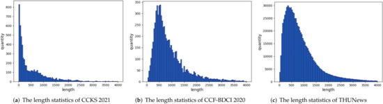 Our experiments were conducted on several open source datasets, CCKS 2021, CCF-BDCI 2020, and THUNews. The CCKS 2021 dataset is a financial risk detection dataset containing 6000 texts from public news and reports. Each text has two classification levels: level1 is 3-tiered for risk categories, and level2 is multi-tiered for risk causality. CCF-BDCI 2020 is a news dataset containing 7320 texts with 10 classes. The THUNews dataset is a large scale news dataset which contains 836,075 instances with 14 classes. Detailed information about the datasets is shown in Table 1. The length statistics of the texts in these two datasets are shown in Figure 5. Obviously, the average lengths of texts in CCF-BDCI 2020 and THUNews are longer than that in CCKS 2021.