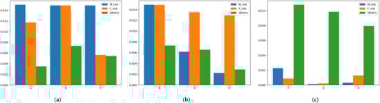 The feature weights’ contributions. The y-axis represents the contribution, and the x-axis represents different features. Specifically, feature A is “[name], [time], [address], identify theft”; feature B is “[organization], [time], phone”; feature C is “[name], [address], steal”; feature D is “[name], [time], cheat”; feature E is “[name], [money], cheat”; feature F is “[name], ID card”; feature G is “[name], [time], accuse”; and feature H is “phone, disseminate.” “M_risk” means “Misappropriation risk”. “F_risk” means “Fraud risk”. (a) The weights of the three features with the highest contributions to “Misappropriation risk”. (b) The weights of the three features with the highest contribution to “Fraud risk”. (c) The weights of the three features with the highest contribution to “Others”.
