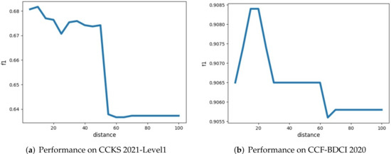 In order to verify the effectiveness of the distance constraint, we firstly adjusted its parameter from 5 to 100, and analyzed then the evolution of performance. Firstly, Figure 7 shows that with the increases in the distance constraint, the macro-F1 at first increased to its maximum and then decreased, and finally stayed at a stable value, which is consistent with the result of MIPELD w/o the distance constraint in the ablation experiment. The reason is that when is relatively small, the distance constraint is more strict and most of the frequent itemsets are excluded; when is large, the distance constraint is too lenient to filter the frequent itemsets, so it loses its effect. Moreover, we can observe that for two datasets, MIPELD achieved its best respectibe performances when = 10 or = 15, respectively. The possible reason is that the average text length of CCKS 2021 is shorter than that of CCF-BDCI 2020.
