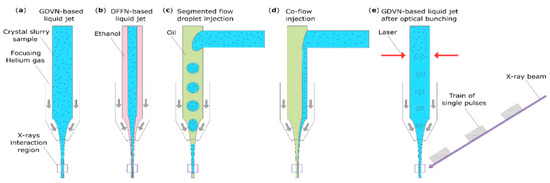 Schematic representations of standard (a,b) and innovative (c–e) injection delivery methods that are compatible with megahertz operation at the EuXFEL: (a) a GDVN-based liquid jet; (b) a DFFN-based liquid jet [38]; (c) a co-flow injection [44]; (d) a segmented flow droplet injection [45]; (e) a GDVN-based liquid jet with optical bunching [46].