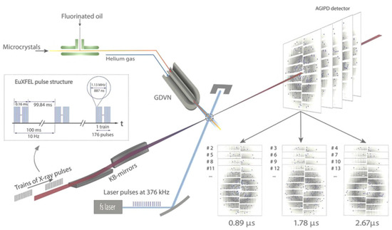 Pump–probe MHz TR-SFX setup using the SPB/SFX instrument of the European XFEL. This setup was implemented during the very first pump–probe TR-SFX experiments [18]. In this setup, X-ray pulses arrive in 1.13 MHz bursts with each burst contains 176 X-ray pulses, which repeat every 100 ms. The fs-pump laser delivers 376 kHz pulses in the blue (λ = 420 nm), tunable based on the sample requirements, synchronized to the X-ray pulses which intersect precisely with the microcrystal jet produced by the GDVN. The pump–probe experimental scheme was designed as follows: one light triggered a (Δt = 0.89 μs) pattern followed by two dark patterns (no light triggering: (Δt = 1.78 and 2.67 μs)) to prevent light contamination from the previous laser excitation. The time delay between each pattern equaled 887 ns, corresponding to the X-ray pulse spacing at 1.13 MHz with each pattern representing a different probed crystal. The TR-SFX diffraction patterns were collected on an AGIPD detector (adapted from [18]).