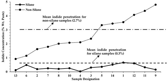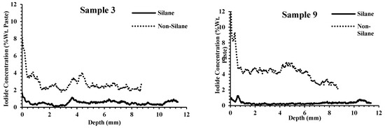 Figure 7 compares the iodide concentrations of all samples at a fixed depth of 2 mm for both silane and non-silane samples. A depth of 2 mm was chosen as the silane was found to penetrate to this depth in all samples investigated.