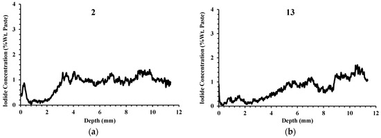 - For the samples not coated with silane, there was large variability among the samples. At 2 mm in depth, some samples had iodide concentrations as low as 1% by weight and some had concentrations greater than 4%. Despite this high variability, the same concrete that was treated with silane showed low iodide concentration at 2 mm, varying between 0.03% and 0.66%.