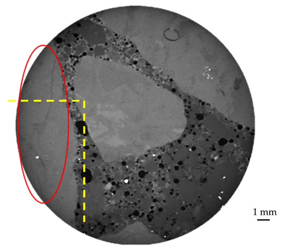 The 2D observation of a microcrack on an aggregate in one of the silane samples (yellow lines show the cutoff region in the 3D image shown in Figure 10).