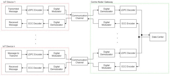 These two factors are likely contradictory because an effective ECC scheme that enables transmission power reduction usually has a high encoding—and especially decoding—complexity. Therefore, we propose the utilization of an LDPC coding scheme in the uplink direction, and we present how an LDPC encoder can be efficiently realized with a microcontroller. As presented in Figure 1, the assumed system model does not fix any specific ECC scheme for the downlink direction (from the gateway to the IoT node).