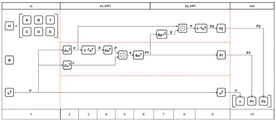 Therefore, computing (10) for QC-LDPC codes requires elementary operations of circular shifts of subvectors of of length P, as well as modulo-2 additions of subvectors of length P, which are equivalent to additions over . Similar elementary operations can be indicated for the other sparsely structured matrices by vector multiplications in Figure 2.