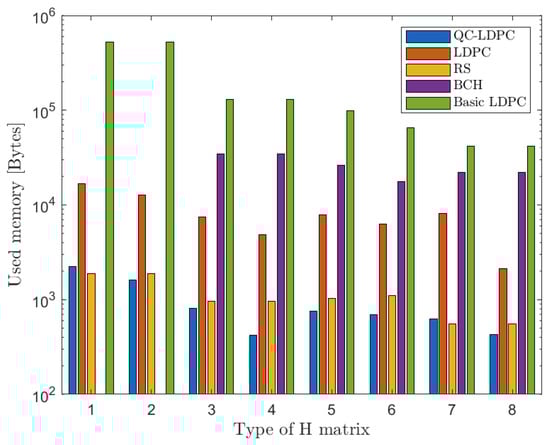 Finally, the third solution, marked with the blue bar in Figure 6, involves the developed QC-LDPC encoding algorithm and the circular shift value representation of . This algorithm is available to encode only QC-LDPC parity-check matrices, but with a broad range of code lengths and rates. The significant memory reduction in the proposed solution was confirmed by the experimental results. It can also be observed that the memory utilization was not greater than that of the RS encoder counterpart implemented with the same microcontroller equipment. In all the presented charts, the proposed encoder is shortly denoted as QC-LDPC, while the index representation solution is denoted as LDPC.