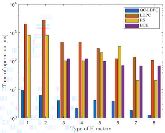 A similar comparison was made for the encoding time measurements. Figure 7 presents the total encoding time of a single block for different parity-check matrices. The measured time involved the data preparation, calculation of parity bits , , and gathering of the output vector. We included results for standard LDPC encoding with the index representation (orange bar), as well as the proposed efficient QC-LDPC encoding (blue bar). A significant encoding time reduction was visible in the case of the developed efficient QC-LDPC algorithm implementation in comparison with the LDPC with the index matrix representation, as well as the Reed–Solomon (RS) encoders. This implementation thus has potential for the reduction in energy consumption in solutions that use sleep modes after the communication of a message from an IoT node. The relation of the working mode time to the sleep mode time can be reduced if the block encoding time is reduced.