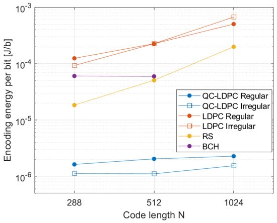 We calculated the normalized energy needed for encoding a single bit of the QC-LDPC codes as well as the other reference encoders. The results are presented in Figure 8. Then, we subtracted the results, obtaining the potential saving that can be achieved, expressed in . These results are presented in Table 3.