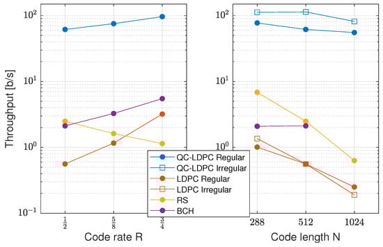 The parameters of the RS and BCH codes, which are counterparts of LDPC , are also presented in Table 2. These codes were used for an experimental comparison of the developed QC-LDPC scheme with classical block codes. Every RS code is clearly defined by its parameters and for BCH codes, we also provide the correction capability parameter , defined as in []. The generator polynomials of RS and BCH codes are obtained as described in [].
