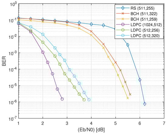 In order to show the coding gain that can be achieved with the QC-LDPC codes employed in comparison with typical classic block codes, we performed Monte Carlo simulations for the QC-LDPC codes, as well as for their RS and BCH counterparts. RS codes with rate , BCH and QC-LDPC codes with different block lengths were used for this comparison. A QPSK modulator and an AWGN channel model were used in the communication system models. The LDPC codes were decoded with a belief propagation (BP) decoder, the BCH codes were decoded with the hard-decision Berlekamp algorithm, and the RS codes were decoded using the Berlekamp–Massey decoding algorithm.
