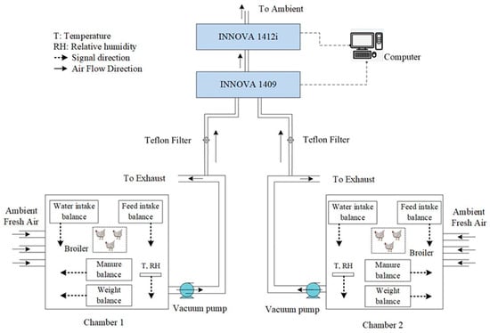 The assessment of the regular emissions during the rearing process is very important in order to reduce them. Before field detection, rearing chamber detection is usually adopted for its easy accessibility [,,]. In this work, a digital rearing chamber inspection system was developed for simultaneous monitoring of broiler growth conditions, as well as emissions of NH3 and CO2 with waste tea litter or without litter. The aim of this experiment was to determine whether waste tea litter could provide a new technique and method for emission reduction and control of NH3 and CO2 in livestock rearing.