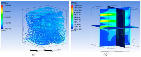 Airflow field analysis diagram of scheme: (a) streamline of air flow field; (b) wind speed contour map.