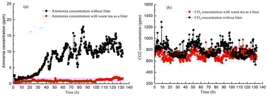 The emissions of each gas showed a significant difference (p < 0.05) between the waste-tea-litter group and the nonlitter group. As shown in Figure 3a, NH3 concentrations in the nonlitter broiler group and the waste-tea-litter broiler group were increased sharply and increased slightly in the early stage of the experiment (2–3 days), respectively, and both were maintained as stable in the middle and later stages. Namely, in two conditions, the NH3 concentrations tended to rise at first and became stable later, and the NH3 concentrations in the nonlitter group were higher than in the waste-tea-litter group. As shown in Figure 3b, the daily average emission concentration of CO2 in the waste-tea-litter group (713 ± 69 ppm) was significantly lower than that in the nonlitter group (797 ± 107 ppm). The highest NH3 emission concentration in the non-litter group was 19 ppm, and the respective value was only 2.2 ppm in the waste-tea-litter group. Therefore, waste tea litter could lower the NH3 and CO2 emissions during the broiler rearing process. As reported [], the NH3 concentration in the air of broiler house should be lower than 25 ppm. When the concentration was higher than 75 ppm, the broiler production performance was reduced greatly; when it was higher than 50 ppm, both daily average feed intake and weight gain were decreased []. As shown in Table 1 and Figure 3, the maximum NH3 concentration was 19 ppm in this experiment, not more than 25 ppm; and the emissions of NH3 and CO2 had almost no effect on the broilers’ growth performance.
