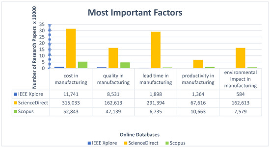 As shown via the graphical display of Figure 1, many research studies have been conducted on cost, then followed by quality, and Lead time, subsequently followed by Productivity and Environmental Impact, respectively. This sequence has been seen in the IEEE Xplore database based on the number of published research papers. In the Science Direct database, a similar trend is seen for Cost but Lead time overtakes quality, followed by Environmental Impact and Productivity sequentially. Based on the captured data from these three different online databases, it can be said that the cost of manufacturing is a key indicator in a manufacturing environment, followed by Quality and Lead time. Priority has been given to these three factors as compared to Productivity and Environmental Impact. Thus, this finding signifies the importance of Cost, Quality, and Lead time in manufacturing systems.
