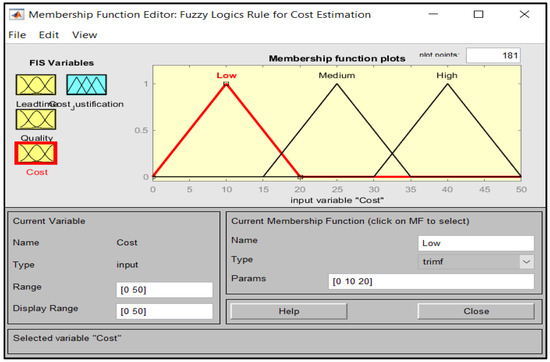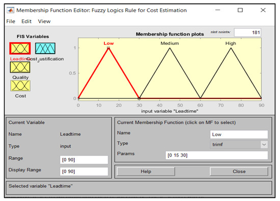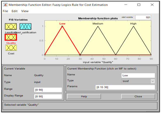 The data used in the fuzzification process are predicted or unsupervised data, which will be validated by engineers three later on using the developed model. Membership Functions are graphical representations used to define the values for each variable that will be later used to define the prediction model’s rules. The setup of the Membership functions for each input is shown below in Figure 5, Figure 6, Figure 7, and Figure 8, respectively. Lead time, Quality, and Cost are used as Inputs to determine the output which is the Cost Justification. For example, in Figure 5 and Figure 6 below, the range of values specified is from 0 to 90. This range was divided into categories to further classify the values for Low, Medium, and High, respectively. These range of values were chosen randomly to provide equal division for the three different value categories for Low, Medium, and High throughout the configurations, further validated by actual field engineers upon obtaining the final results corresponding to these specified values. Table 2 and Table 3 additionally display the categorization of these ranges of values used for the configurations.