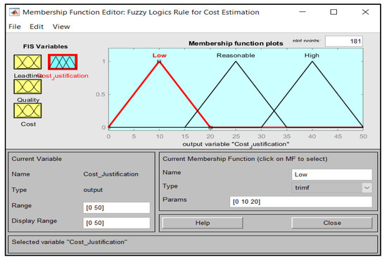 This section will show the setup of the membership functions for each input and output variable. Then, the rules defined in Fuzzy Logic to determine the Cost Justification are shown, together with some sample results based on the prescribed rules and analysis, for three types of configurations with the Lead time value in a single Fuzzy Logic Model. Lead time as the Low, Medium, and High-value input variable will be the key variable to affect the other input variables towards the Cost Justification output.