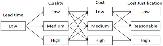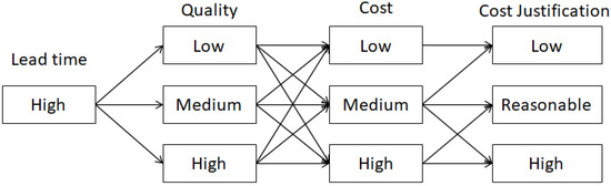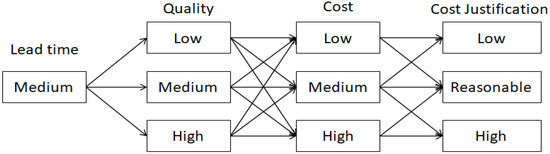 In the second configuration, as shown in Figure 10 below, the medium lead time value is paired with low, medium, and high values of quality, followed by Low, Medium, and High values of cost. Each arrow is used as a prediction rule to determine the cost Justification. For instance, High-quality value is paired with low cost and medium lead time, which can be further justified as low cost or reasonable cost. This is ruled out based on prediction and will be further validated by an engineer later in this section.