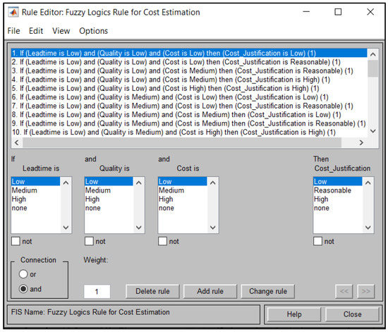 In the third configuration, High lead time value is paired with Low, Medium, and High value of quality, followed by Low, Medium, and High value of Cost. Each arrow is used as a prediction rule to determine the Cost Justification. For illustration, cost justification is supposed to be low or Reasonable if the Lead time is high, but the quality and Cost factors are medium. This is based on predictions using Fuzzy Logic rules. However, the validity of the cost justification will be validated by an engineer later in this section. Figure 11 below shows the rules setup.