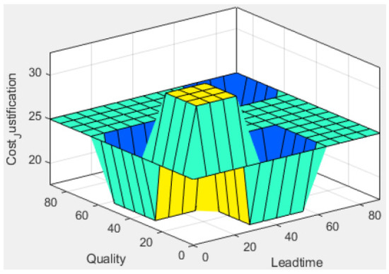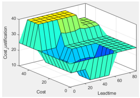 Figure 15 displays the total summary of tests conducted and their respective results. Nine tests were conducted using the Fuzzy Logic configuration model that was developed using MATLAB, as shown in Figure 15. Each of the three different types of configurations was evaluated by three different scenarios for each configuration, respectively. The values used for each configuration testing are specified in Table 5, Table 6, and Table 7, respectively. As shown in the bar chart below, each configuration test consists of a pairing of Lead time with Quality and Cost under three different settings, respectively. Firstly, Lead time is set to be low in the first configuration and paired with Quality and Cost, followed by medium Lead time with Quality and Cost, and high Lead time with Quality and Cost, respectively. The values of quality and Cost were also set up under the settings of Low, Medium, and High in each configuration alternatively. The factors which acted as the input values, cost Justification variable was used as the output, and the values of Cost and Cost Justification were set to be similar. Lead time and quality were given the same range of values for Low, Medium, and High, whereas Cost and Cost Justification was set with a similar range for Low, Medium, or Reasonable and High. Lead time, Quality and Cost are indicated with the clustered columns, while the stacked line with blue markers indicates the final output for cost justification. C1 T1 represents Configuration 1 Test 1, and the rest of the clustered column naming follows suit in the bar chart. From the chart, the Cost Justification is shown to be Low or Reasonable if a low Lead time is paired with high quality and low cost as seen in C1 T3, and if medium Lead time is paired with medium Quality and low or medium Cost, as shown in C2 T3. Next, this happens if a high Lead time is matched with high quality and low cost as displayed in C3 T1.